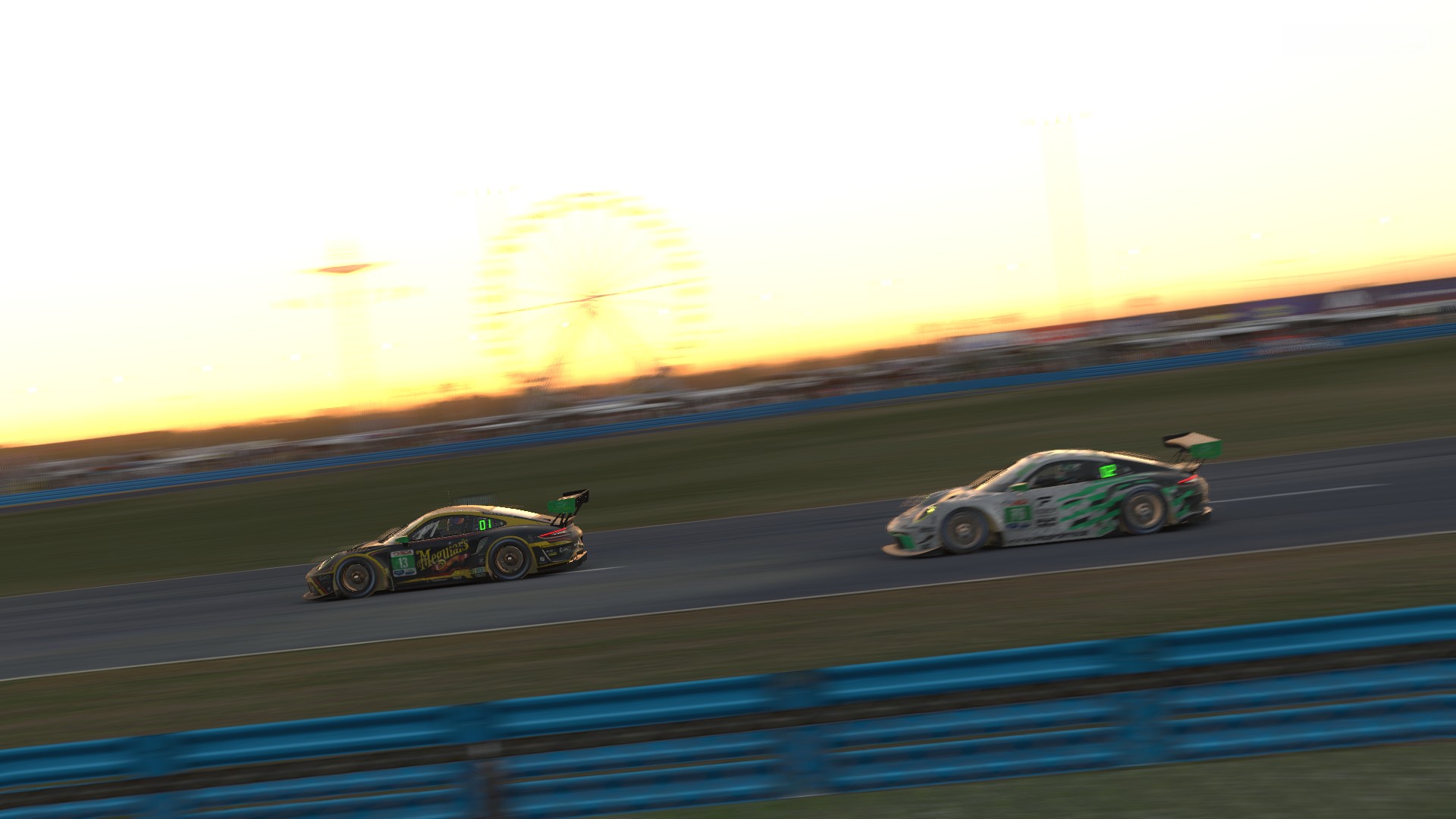 | The No. 13 Meguiars Porsche of FR13DA Sports Group and No. 76 Porsche of NReSports put on an epic GT3 class battle in the early Sunday morning hours |