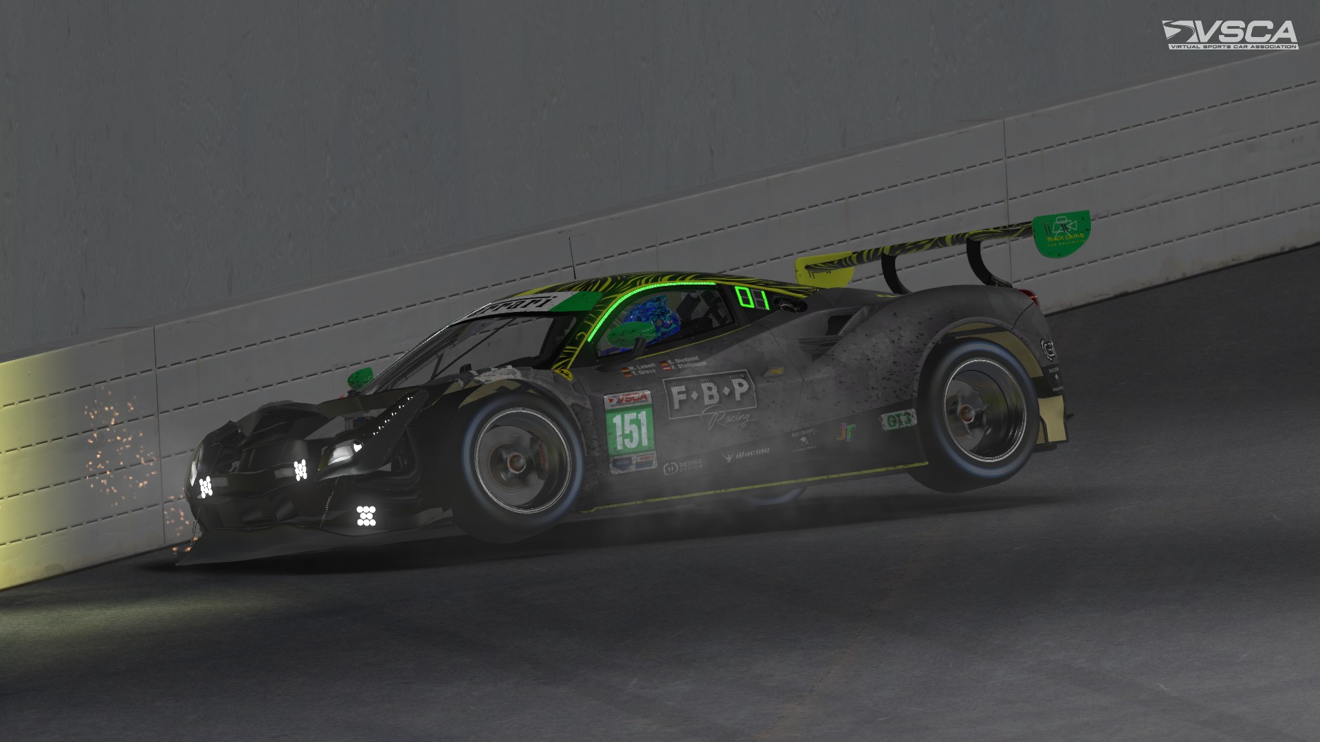 While holding the GT3 class lead over the No. 77 Porsche of Shamrock SimRacing, Evan Dietzold in the No. 151 Ferrari of FBP Racing was startled when he was cut off by the No .43 P2 class prototype of Torque Freak Racing’s Treavor Vavrosky, sending the Ferrari hard into the wall, totalling the car and ending the team’s race early. Race control issued a stop & hold 1 lap penalty against the Torque Freak Racing machine, but for FBP Racing the race came to a bitterly disappointing early end, realizing the damage on the car was impossible to repair.