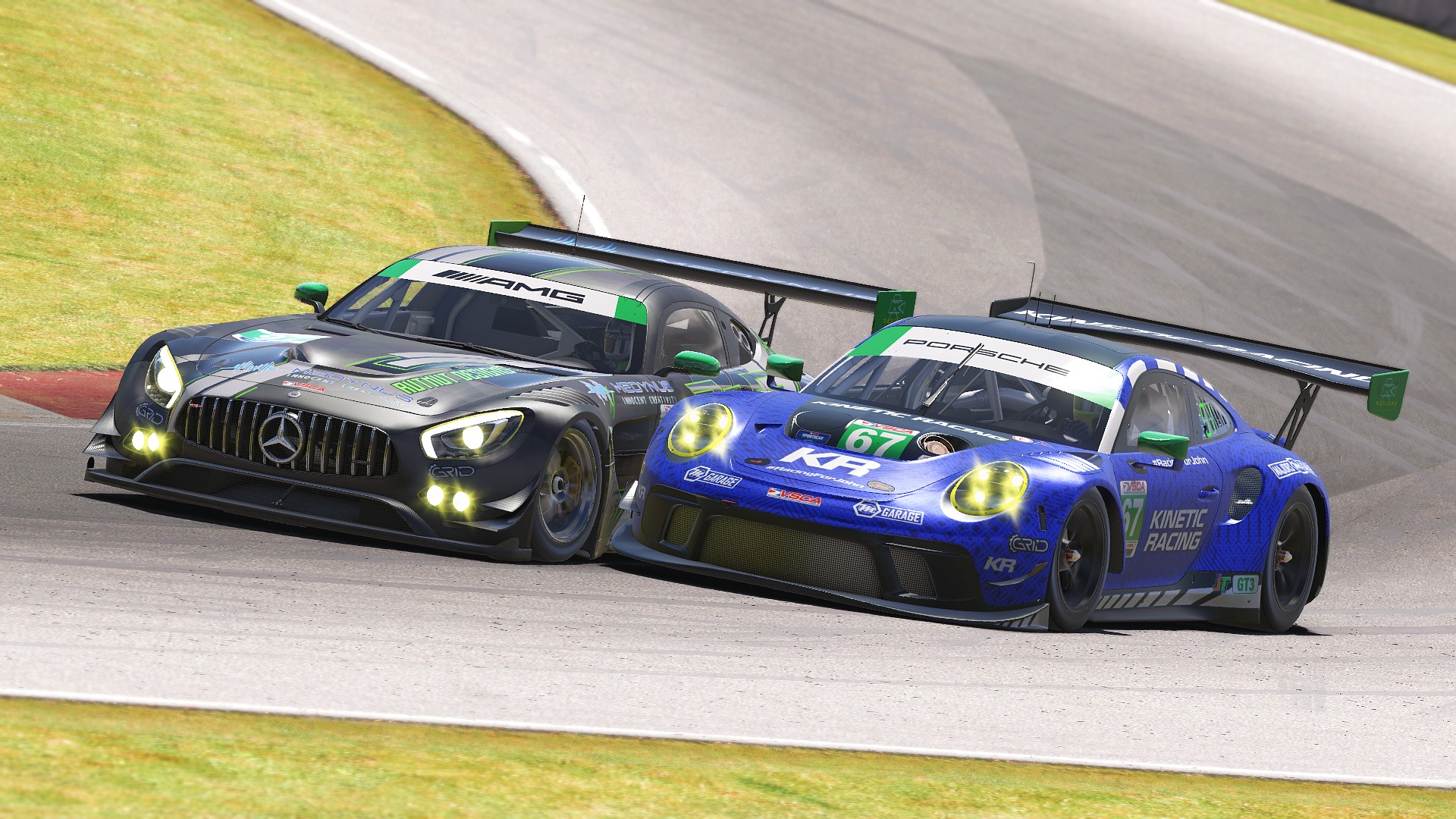 | The No. 97 DRG Racing Mercedes AMG GT3 and the No. 67 Porsche of Kinetic Racing engaged in a long and entertaining GT3 class battle early on. They wound up finishing sixth and second, respectively. |