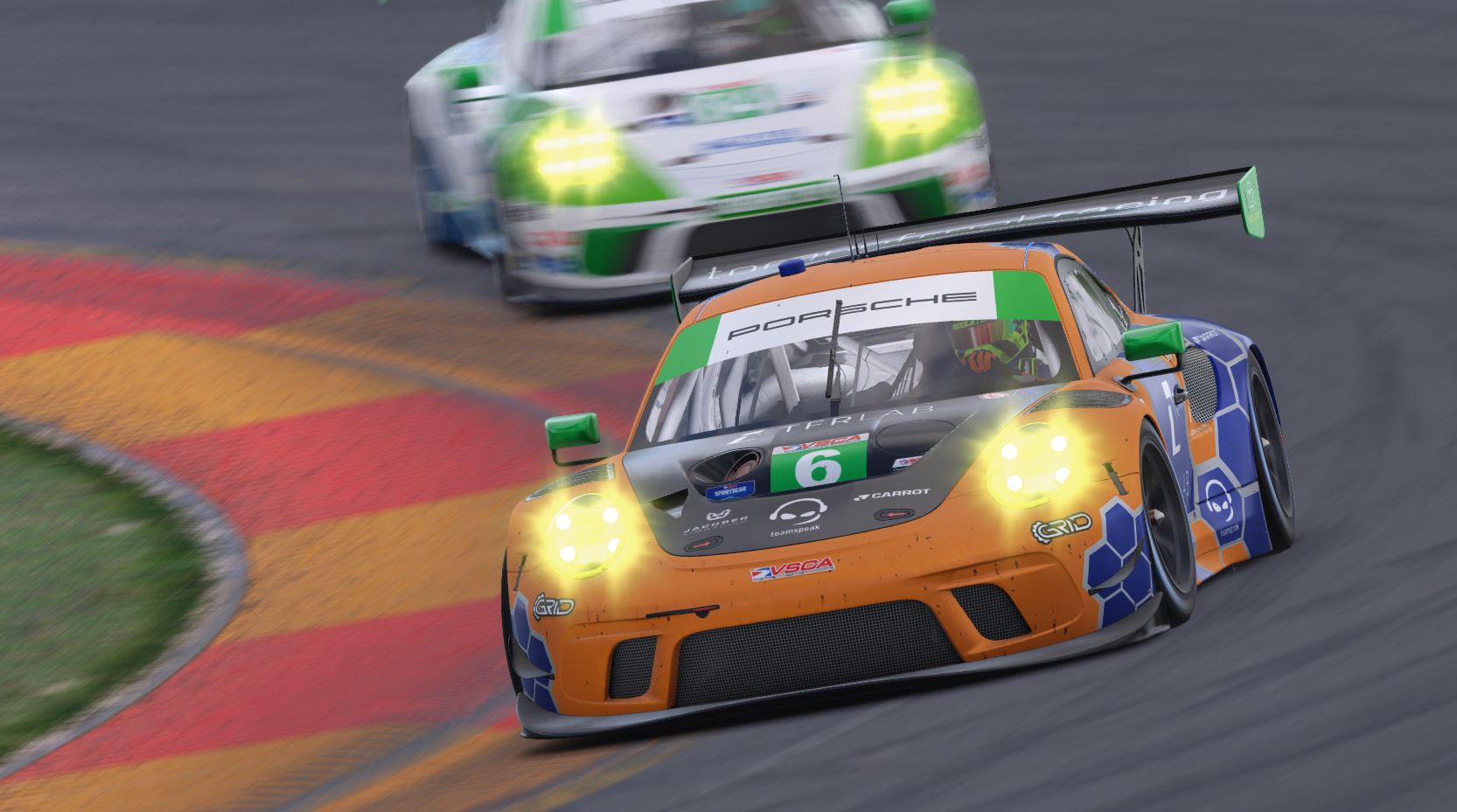 Element SimRacing celebrates a dominant win in a thriller of a race in Saturday's 6 Hours of the Glen, to earn their No. 7 Dallara's second season victory in the VSCA SportsCar Championship. The German team with drivers Nils Hundehege and Jan Vollmers inherited the lead when the No. 10 Dallara of Race4CAT Motorsport crashed on lap 152, and never looked back, storming to the top step of the podium.