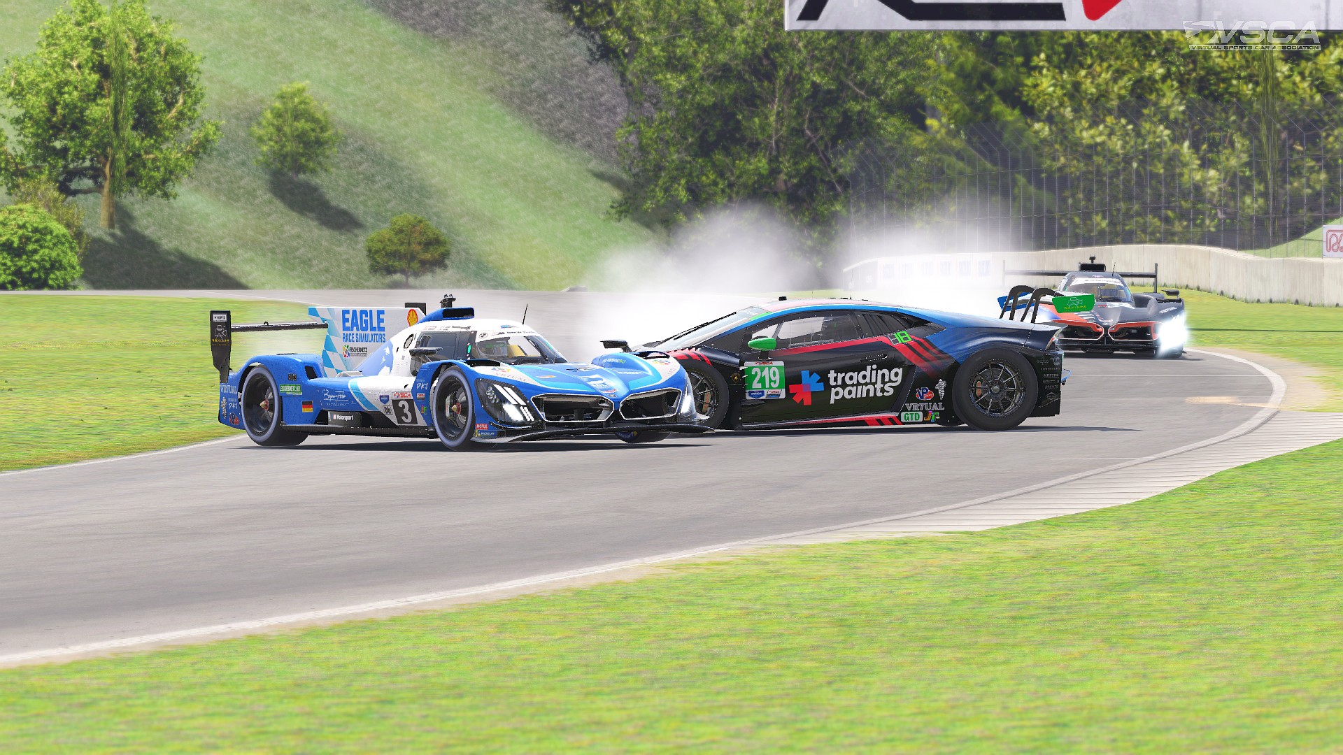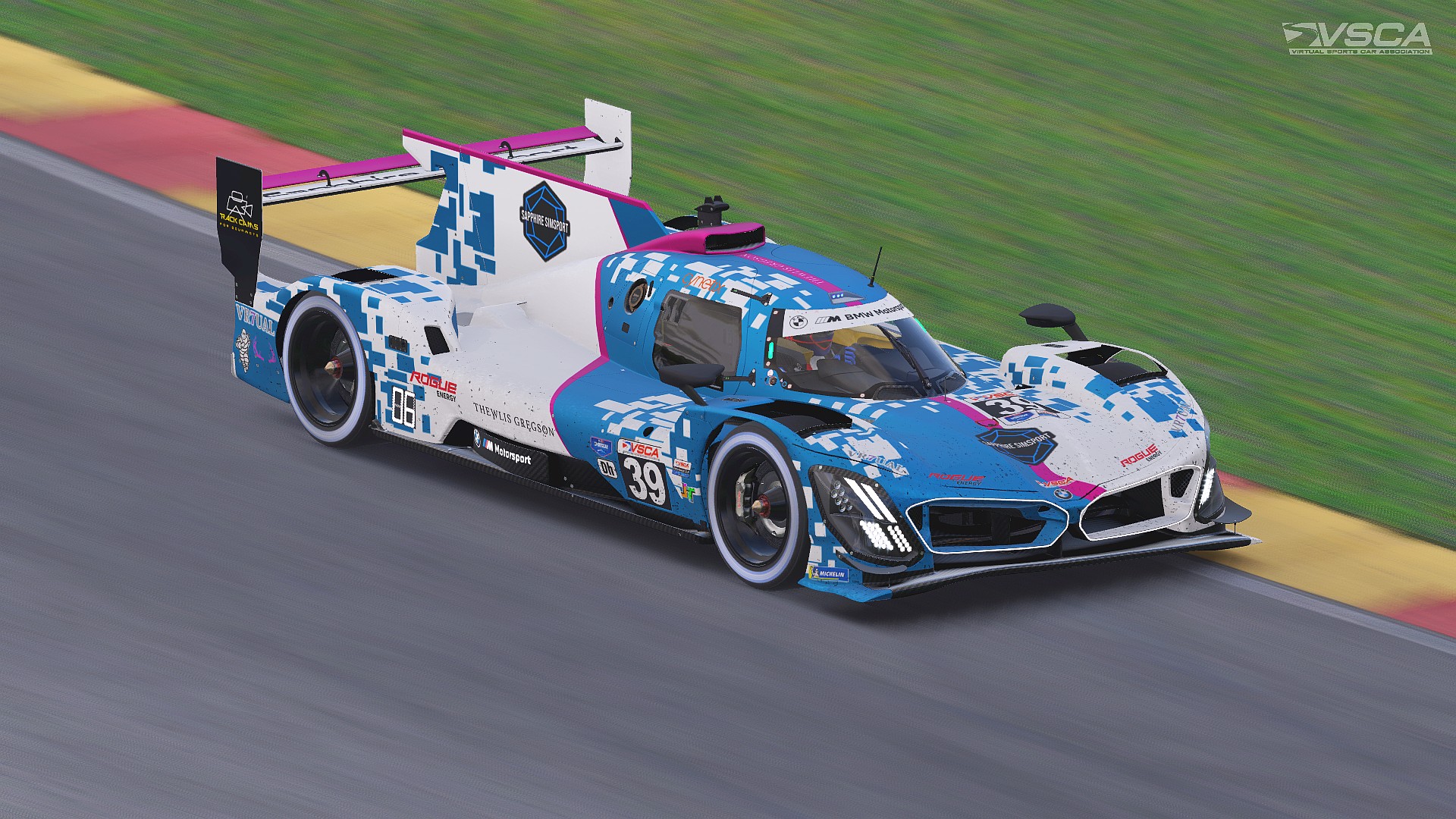 New series debutants No. 39 BMW of Sapphire SimSport, finished fourth, two laps down, after getting caught up in an incident between the No. 79 and No. 51 car on lap one, directly up ahead in turn twelve.